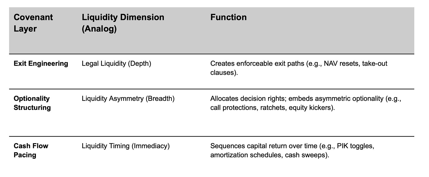 “Unlike public markets, where valuation is anchored in continuous pricing, dealer intermediation, and standardized benchmarks, private credit operates within a legal environment where liquidity is neither spontaneous nor infrastructurally produced. In this setting, capital movement depends entirely on what is permitted by contract. Yield, similarly, is not discovered through trading activity but structured ex ante through covenants that govern exit pathways, embedded optionality, and cash flow dynamics.”