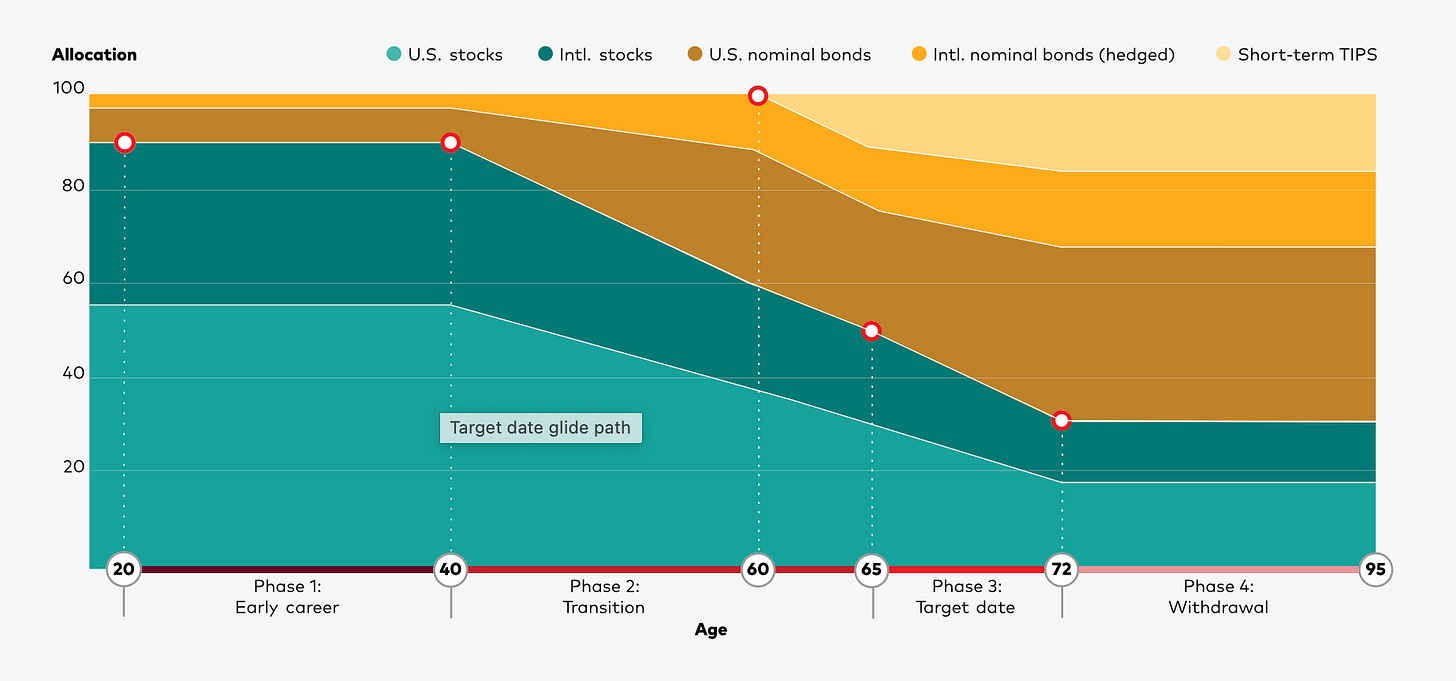 Consider, the Vanguard retirement glidepath, which logically starts you off overweight to equities, even a large allocation to international equities and then, rather abruptly, after age forty starts aggressively buying bonds.
