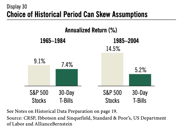 “If we had employed a static return-generation approach 25 years ago, using return data from 1965 to 1984, our assumptions might have called for nominal S&P 500 stock returns of just 9.1% per year and cash returns of 7.4%! These assumptions would have served as a poor basis for modeling returns in the subsequent 25 years, when the S&P 500 returned 14.5% per year versus 5.2% for T-bills.”