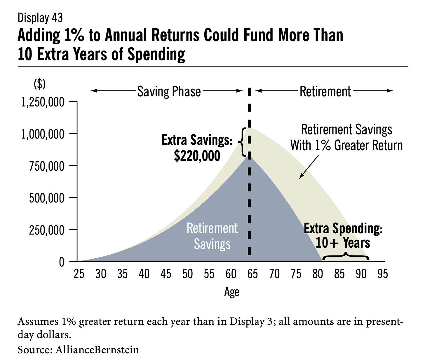 AB finds in their analysis that, “[w]hen the investment horizon is very long, small differences in return can make a huge difference: Adding one percentage point to annual returns could provide over 10 more years of spending. Thus, target-date retirement funds should seek extra return wherever possible.”
