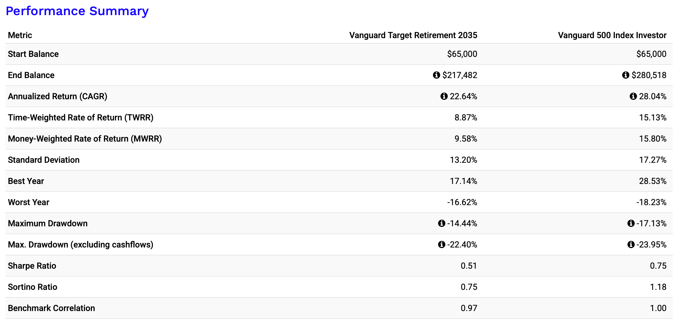Since its inception in 2003, when our hypothetical retiree would have been 33, the Vanguard 2035 fund has an annualized return of 7.96%, versus around 11% for the S&P 500. Again, the point is not that 100% equities is a viable alternative, it’s that the conservative glide path has reduced returns without significantly reducing market risk.